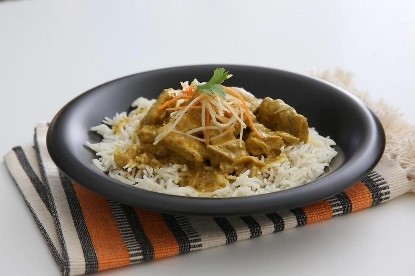 - תבשיל תאילנדי המורכב מחצילים ופטריות בחלב קוקוס וקארי על מצע אורז.
