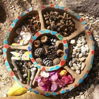 השימוש באוצרות מן הסביבה: אבנים, זרעים, חרוזי עץ, עלים, זרעים, תרמילים, קליפות עצים, קרטון, נייר גרוס, פקקי שעם בשילוב חומרי מיחזור (ecoart).